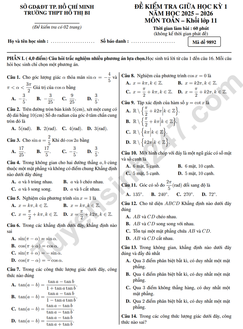 Mời các em học sinh cùng quý phụ huynh tham khảo đề thi giữa học kì 1 năm học 2025 - 2026 môn Toán của trường THPT Hồ Thị Bi bên dưới.