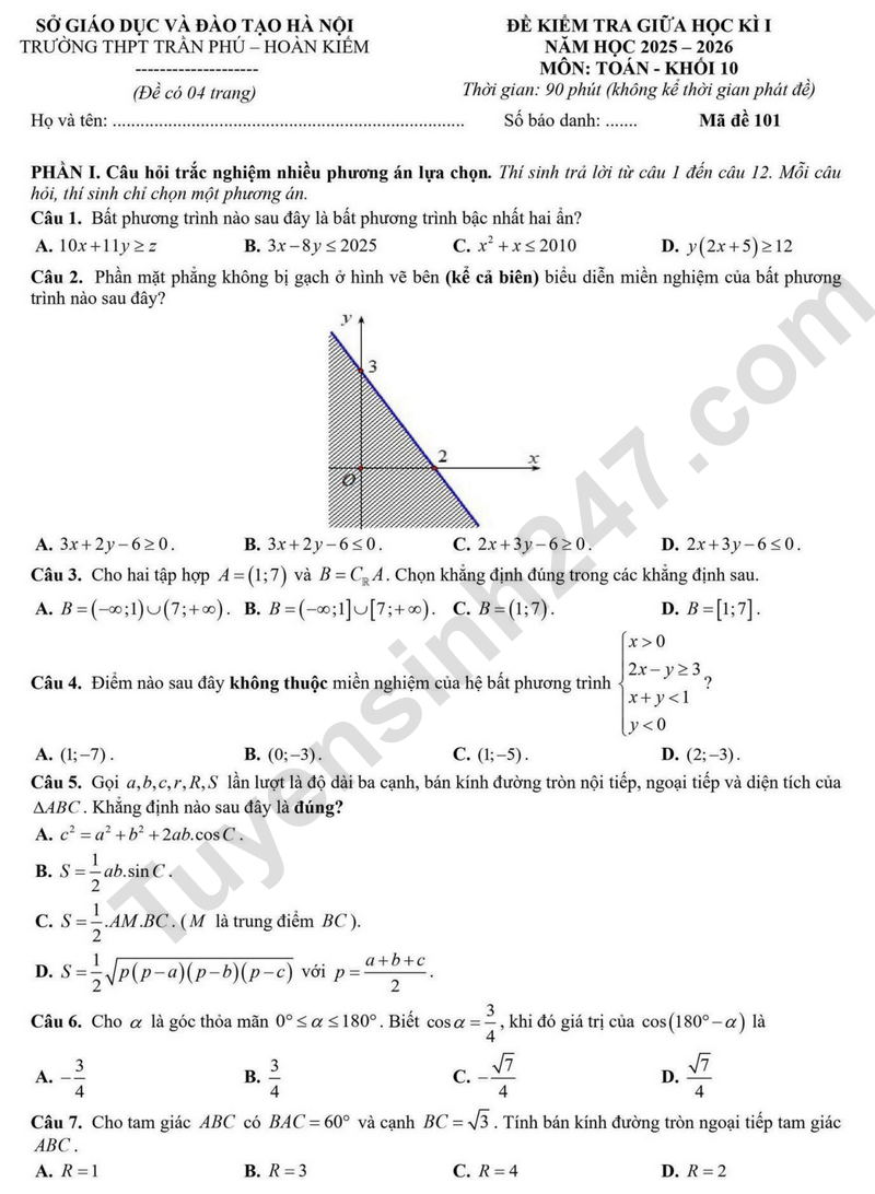 Chi tiết đề thi giữa học kì 1 lớp 10 năm học 2025 - 2026 môn Toán của trường THPT Trần Phú, Hoàn Kiếm có nội dung như sau: