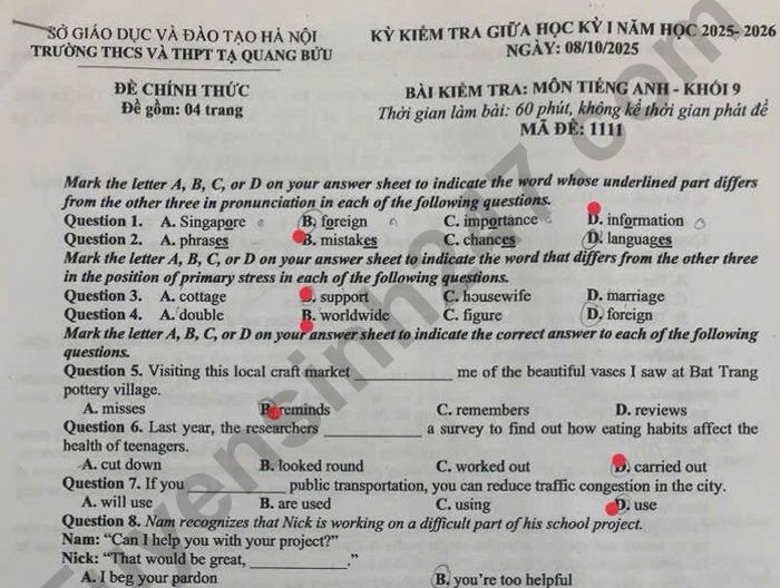 Đề kiểm tra giữa kì 1 lớp 9 môn Anh năm học 2025 - 2026 trường THCS&THPT Tạ Quang Bửu (Hà Nội) được đăng tải dưới đây gồm 04 trang.