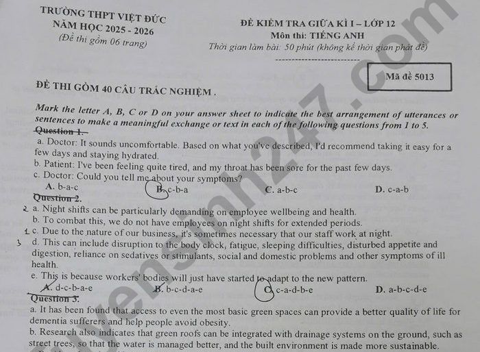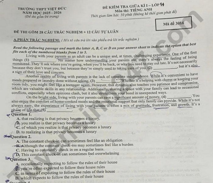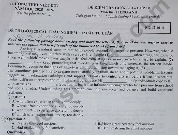 Đề thi giữa kì 1 lớp 10 môn Anh năm học 2025 - 2026 trường THPT Việt Đức, Hà Nội mã đề thi 1014 gồm 04 trang, thời gian làm bài 50 phút.