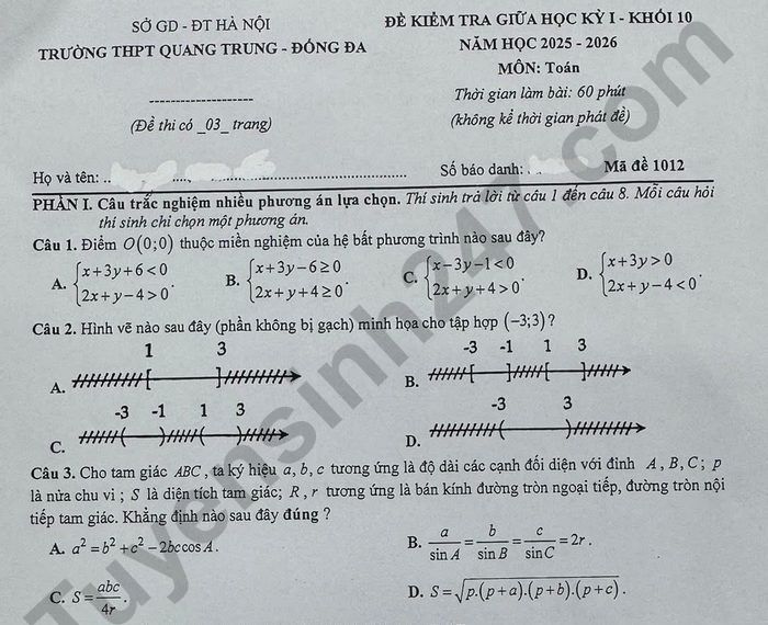 Nội dung chi tiết đề kiểm tra giữa học kì 1 môn Toán lớp 10 của trường THPT Quang Trung - Đống Đa (Hà Nội) năm học 2025 - 2026 như sau: