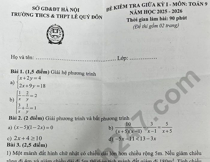 Đề thi giữa kì 1 lớp 9 môn Toán năm học 2025 - 2026 trường THCS&THPT Lê Quý Đôn được Dethihocki.com đăng tải dưới đây, các em cùng tham khảo.
