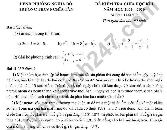 Dưới đây là đề thi giữa kì 1 lớp 9 môn Toán trường THCS Nghĩa Tân năm học 2025 - 2026 được đăng tải phía dưới, các em tham khảo.