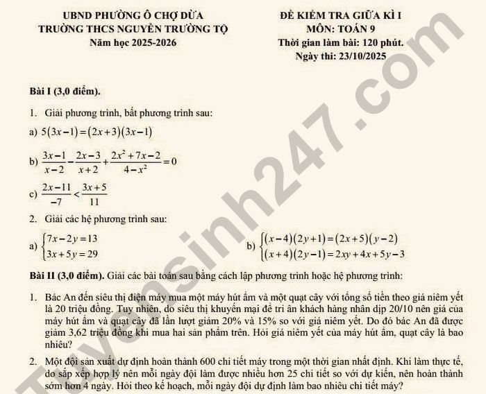 Đề thi và đáp án chi tiết đề thi giữa học kì 1 lớp 9 môn Toán năm học 2025 - 2026 trường THCS Nguyễn Trường Tộ (phường Ô Chợ Dừa).