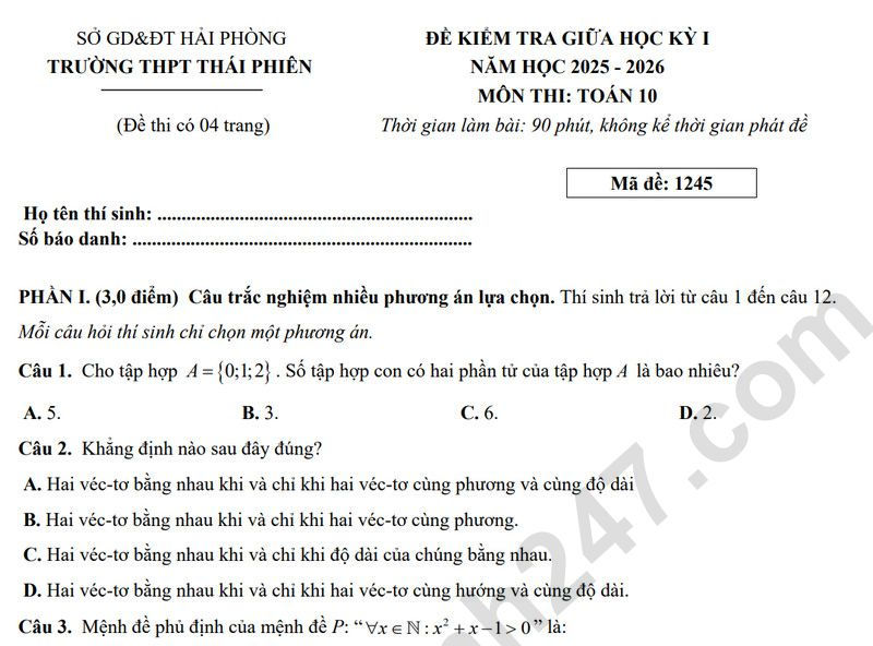 Mời các em học sinh cùng tham khảo đề thi giữa học kì 1 năm học 2025 - 2026 môn Toán lớp 10 của trường THPT Thái Phiên dưới đây.