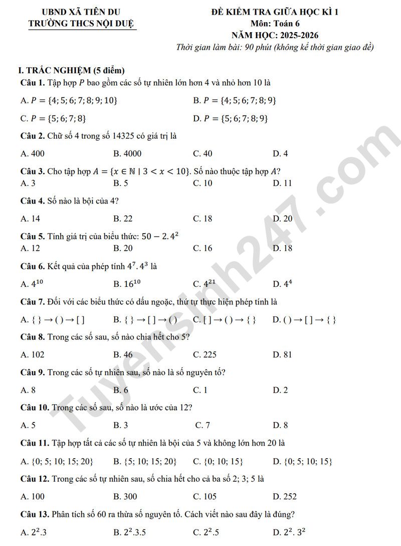 Dưới đây là đề thi giữa kì 1 lớp 6 môn Toán năm học 2025 - 2026 của trường THCS Nội Duệ kèm đáp án chi tiết.