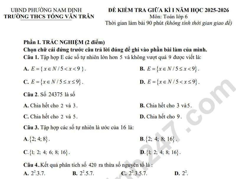 Nội dung đề kiểm tra giữa học kì 1 môn Toán lớp 6 năm 2025 kèm đáp án chi tiết của trường THPT Tống Văn Trân như sau: