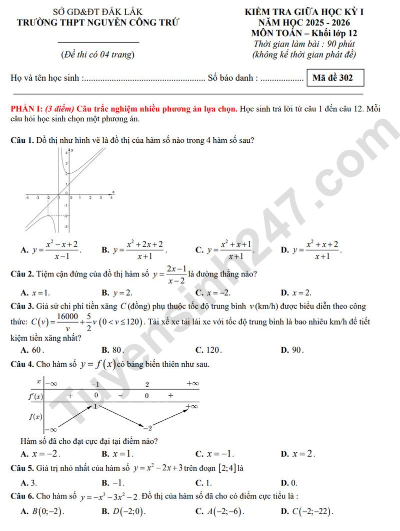 Đề kiẻm tra giữa học kì 1 môn Toán lớp 12 năm học 2025 - 2026 trường THPT Nguyễn Công Trứ có nội dung như sau: