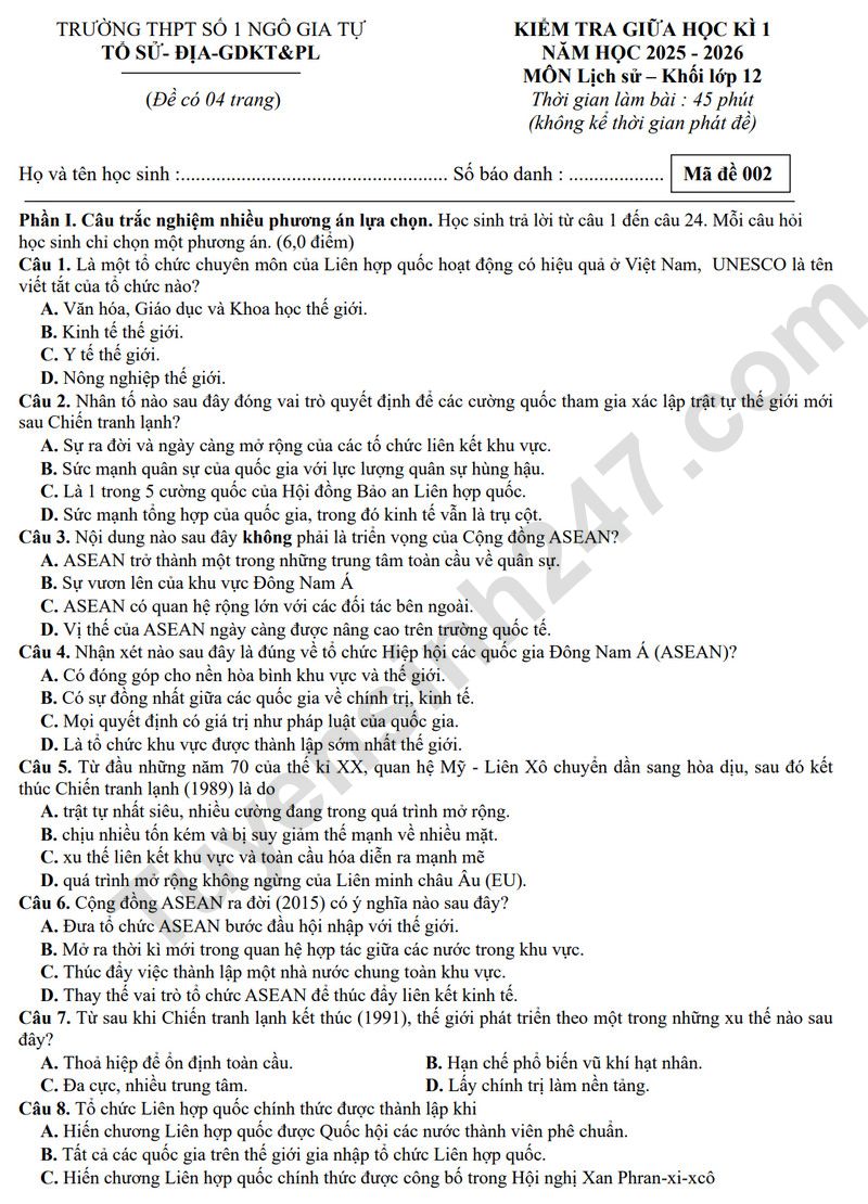 Xem ngay đề kiểm tra giữa học kì 1 lớp 12 môn Toán của trường THPT số 1 Ngô Gia Tự năm học 2025 - 2026 dưới đây.