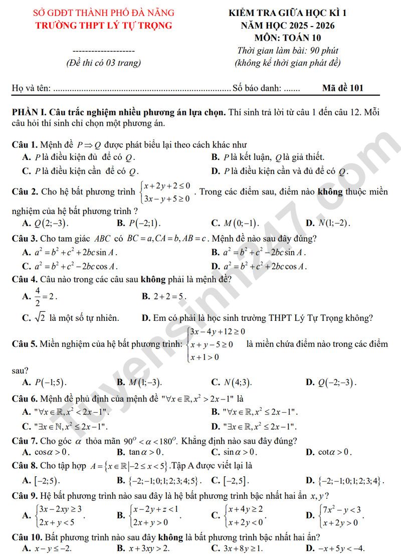 Mời các em học sinh cùng tham khảo đề thi giữa học kì 1 năm học 2025 - 2026 môn Toán của trường THPT Lý Tự Trọng được đăng tải chi tiết bên dưới.