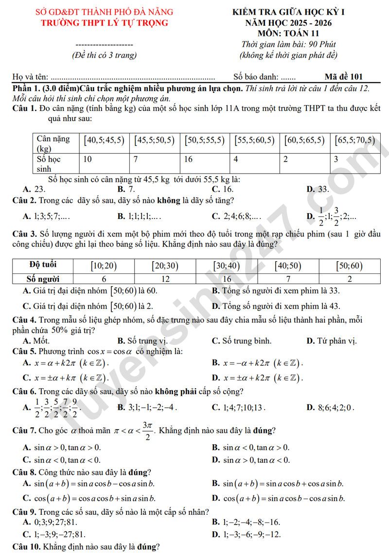 Đề kiểm tra giữa học kì 1 năm học 2025 - 2026 môn Toán lớp 11 của trường THPT Lý Tự Trọng gồm có 3 trang như sau: