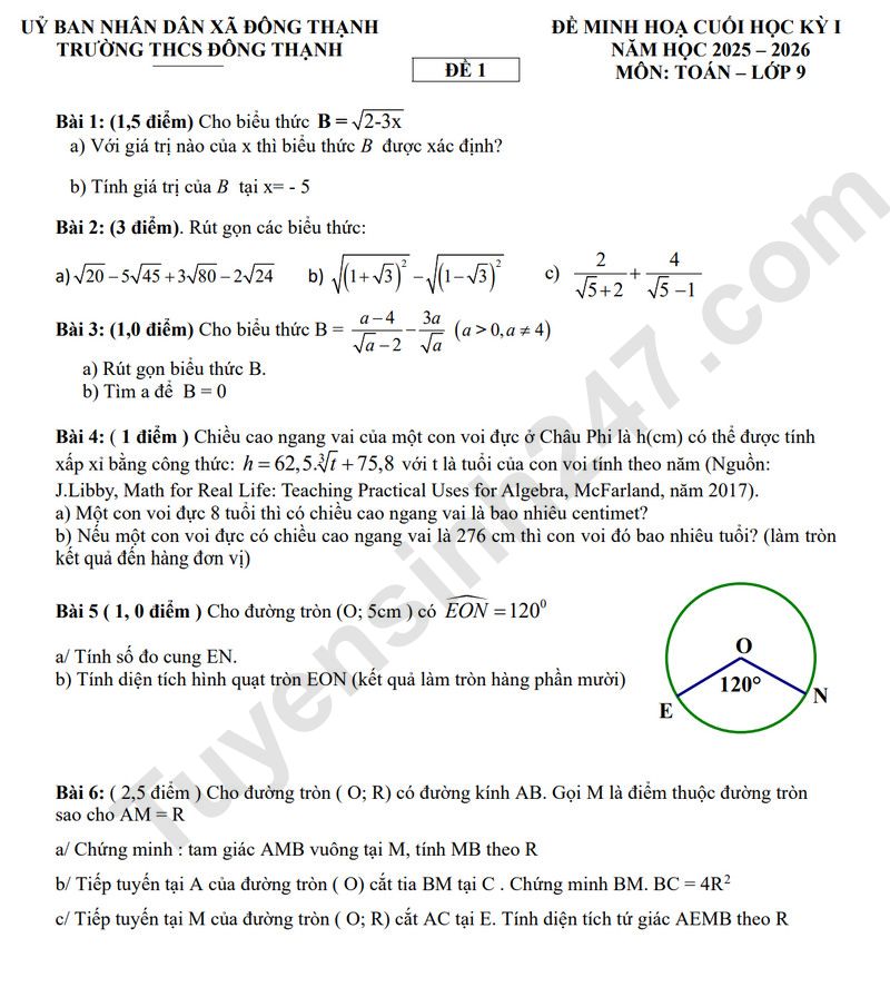 Mời quý phụ huynh cùng các em học sinh tham khảo đề thi học kì 1 năm học 2025 - 2026 môn Toán lớp 9 của trường THCS Đông Thạnh bên dưới.