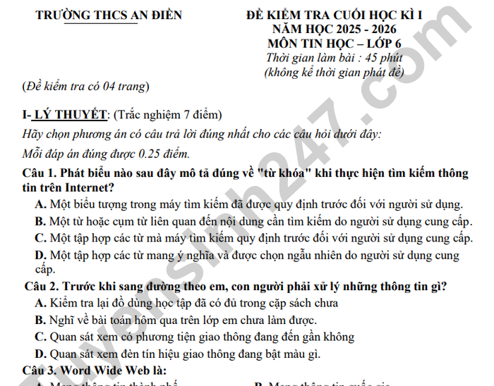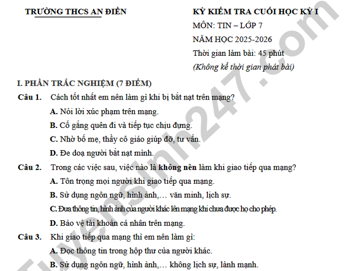 Đề thi cuối kì 1 năm học 2025-2026 trường THCS An Điền môn Tin lớp 7 có thời gian làm bài 45 phút, nội dung chi tiết gồm 04 trang.