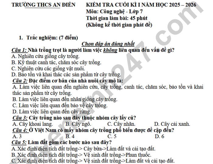 Xem chi tiết dưới đây đề thi học kì 1 lớp 7 Công nghệ năm học 2025 - 2026 của trường THCS An Điền.