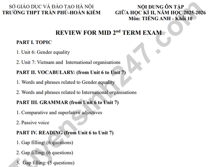 Tham khảo dưới đây nội dung ôn tập giữa kì 2 môn Tiếng Anh lớp 10 của trường THPT Trần Phú-Hoàn Kiếm (Hà Nội) năm học 2025-2026.
