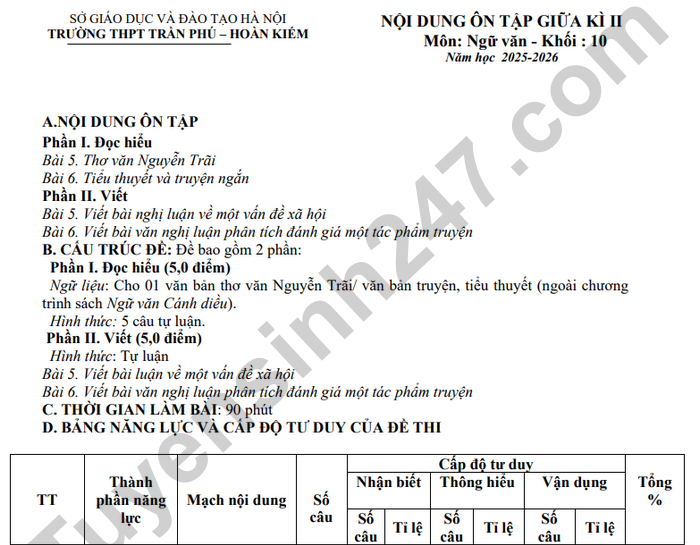 Tham khảo ngay dưới đây nội dung ôn tập giữa kì 2 lớp 10 môn Văn năm học 2025-2026 trường THPT Trần Phú-Hoàn Kiếm, Hà Nội.
