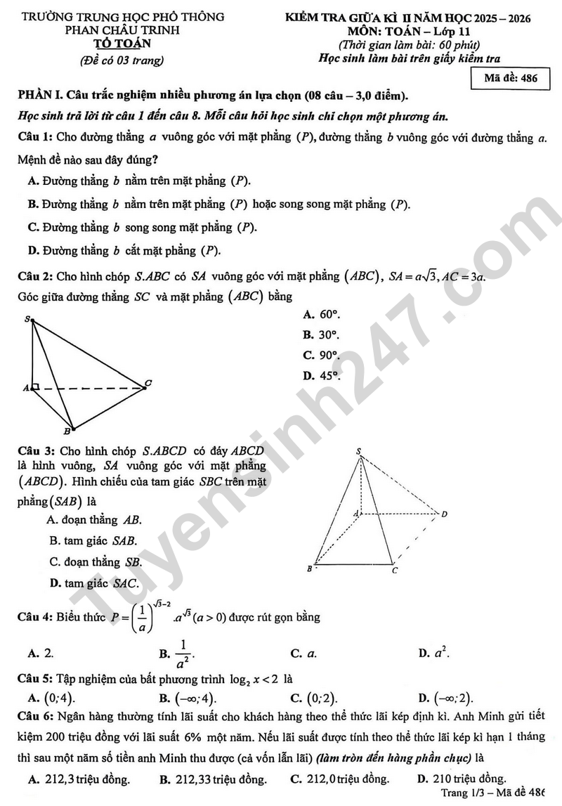 Đề thi giữa học kì 2 lớp 11 năm học 2025 - 2026 môn Toán trường THPT Phan Châu Trinh, TP Đà Nẵng như sau: