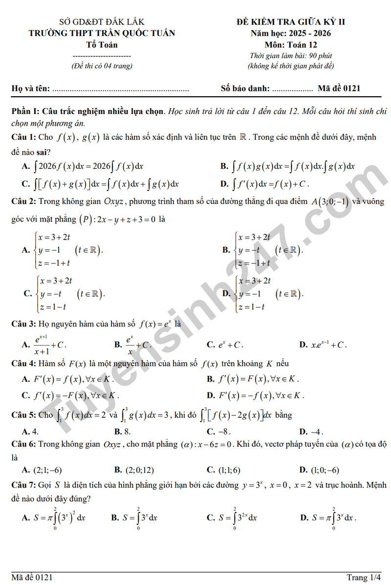 Đề thi giữa kỳ 2 Toán 12 năm 2025 – 2026 trường THPT Trần Quốc Tuấn được xây dựng gồm 4 trang với thời gian làm bài 90 phút, cụ thể như sau: