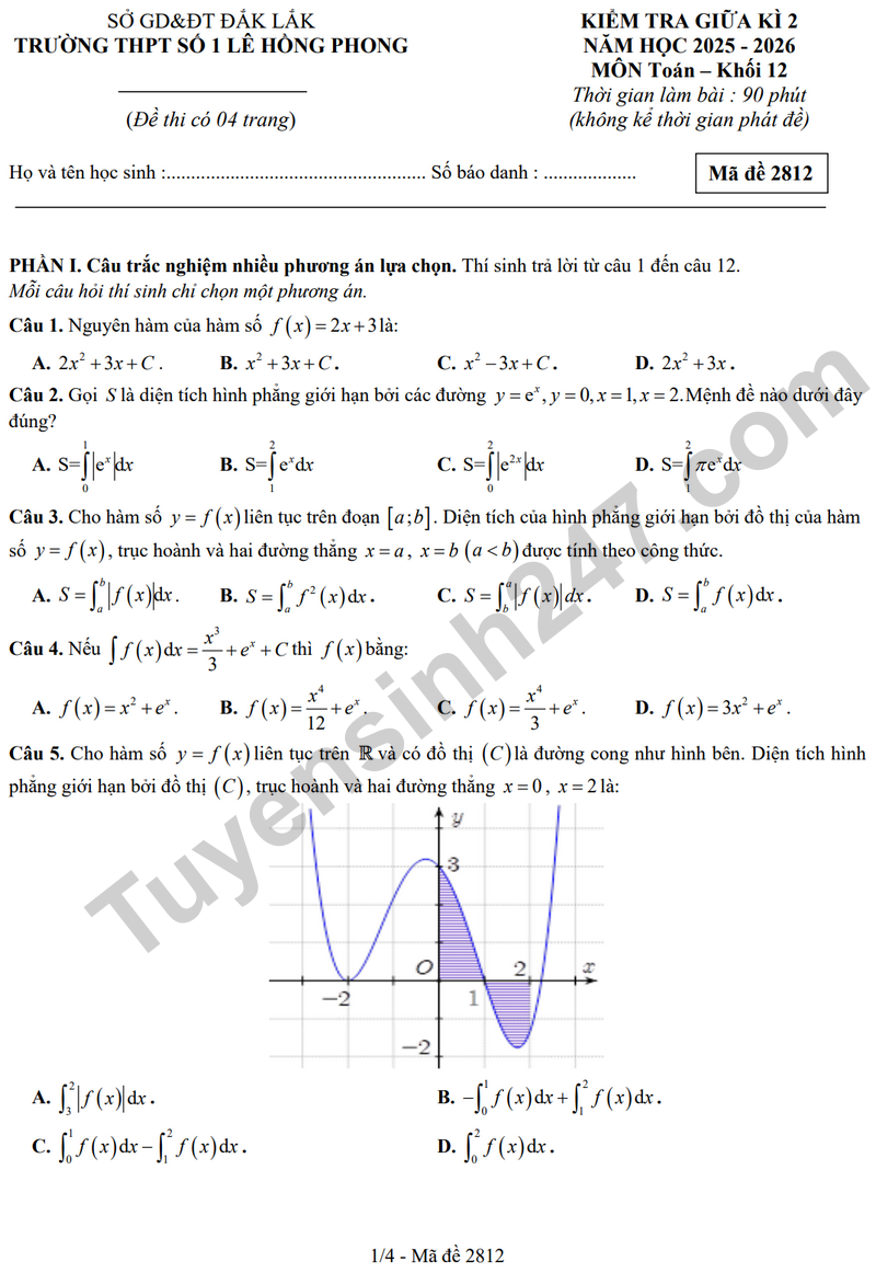 Đề thi giữa kì 2 Toán 12 năm 2025 – 2026 trường THPT Lê Hồng Phong 1 gồm 4 trang và có đáp án và hướng dẫn chấm điểm. Các em tham khảo đề thi bên dưới: