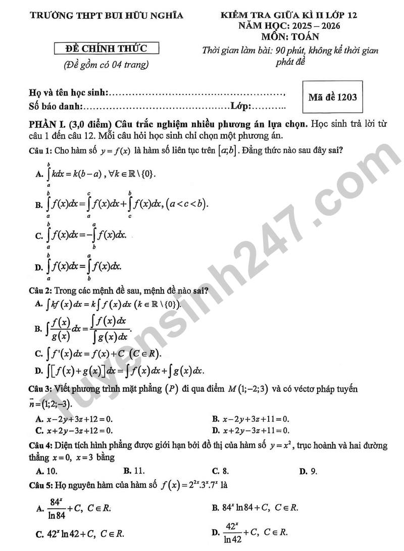 Đề kiểm tra giữa kì 2 Toán 12 năm 2025 – 2026 trường THPT Bùi Hữu Nghĩa gồm 4 trang, cụ thể như sau: