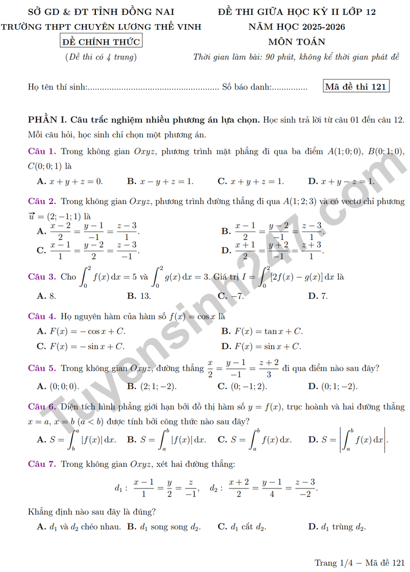Đề thi giữa kỳ 2 Toán 12 năm 2025 – 2026 trường chuyên Lương Thế Vinh gồm 12 câu trắc nghiệm nhiều phương án lựa chọn + 04 câu trắc nghiệm đúng sai + 06 câu trắc nghiệm trả lời ngắn, thời gian làm bài 90 phút, có đáp án và lời giải chi tiết mã đề 121 – 122 – 123 – 124.