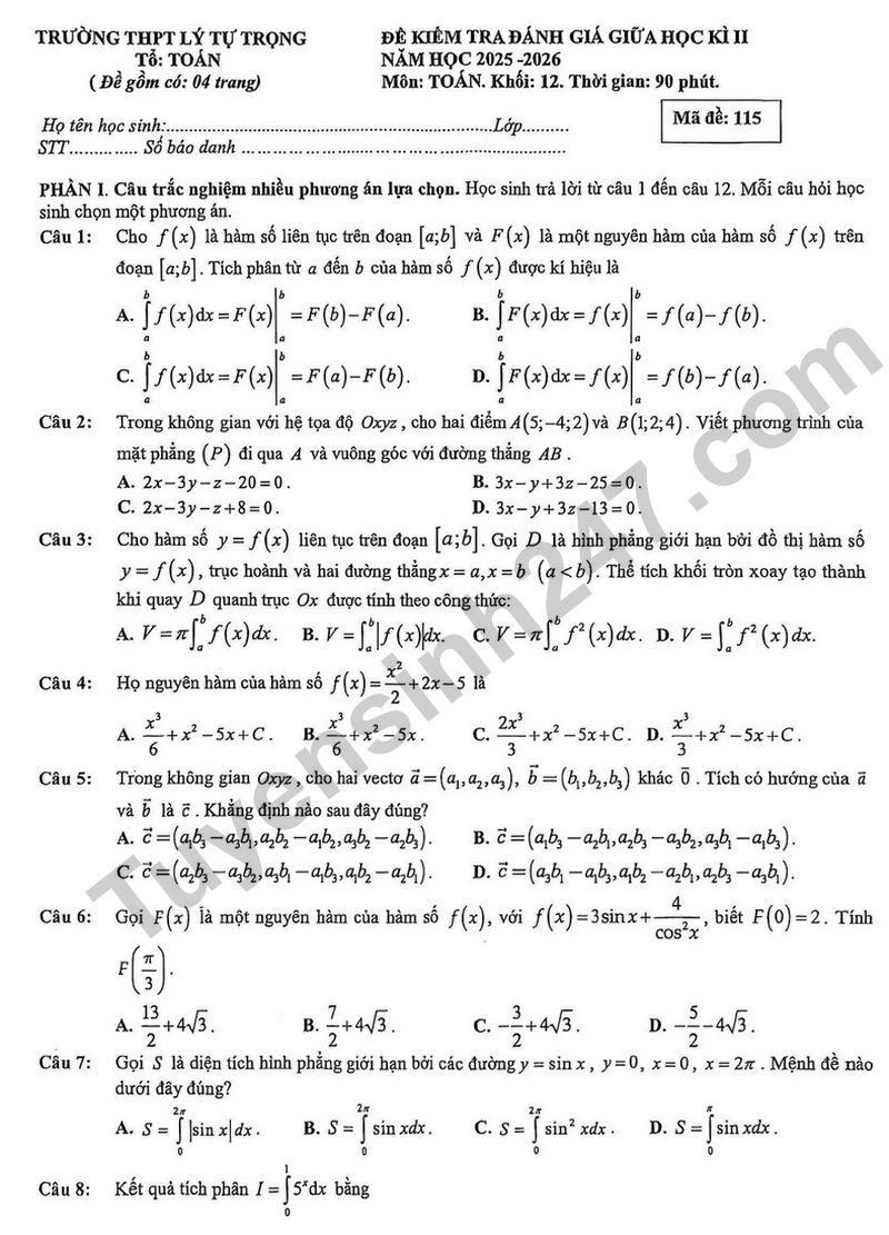 Đề thi giữa kì 2 Toán 12 năm 2025 – 2026 trường THPT Lý Tự Trọng gồm 4 trang với thời gian làm bài 90 phút, cụ thể như sau: