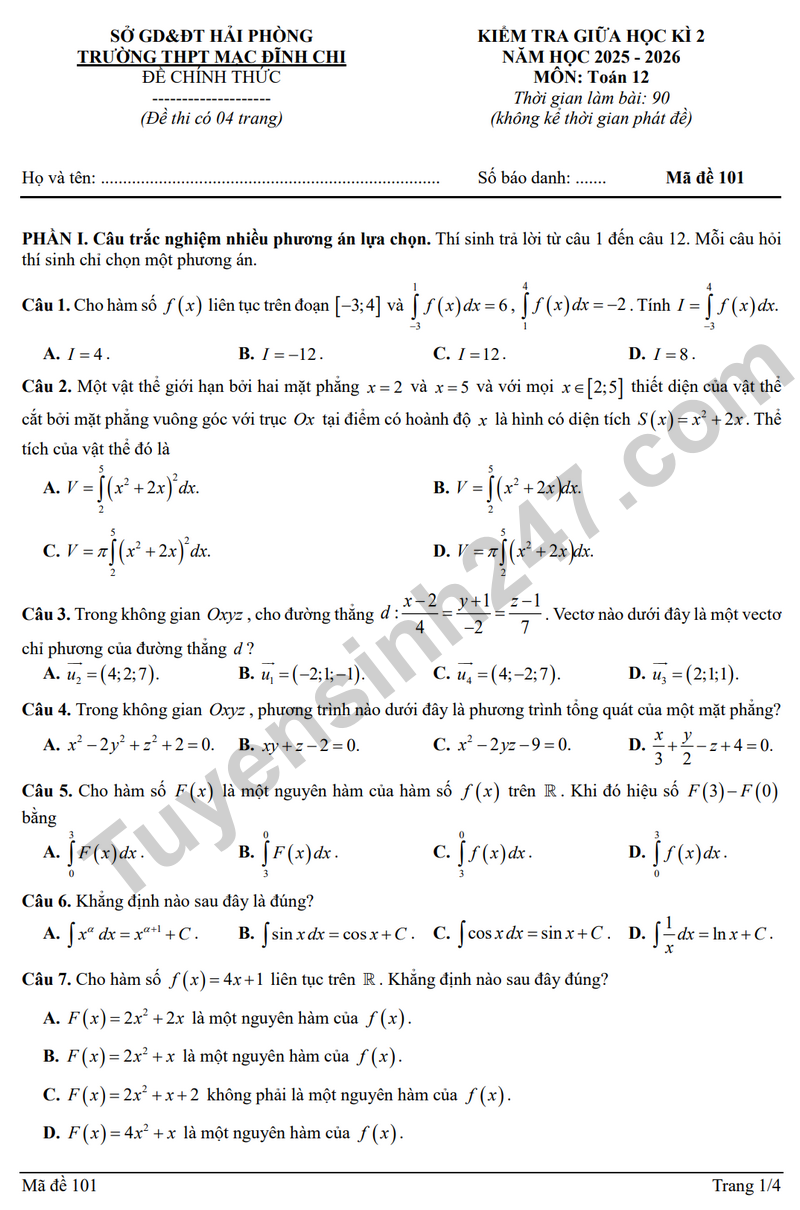 Đề thi giữa học kì 2 Toán 12 năm 2025 – 2026 trường THPT Mạc Đĩnh Chi cấu trúc 03 phần: 30% trắc nghiệm nhiều phương án lựa chọn + 40% trắc nghiệm đúng sai + 30% trắc nghiệm trả lời ngắn, thời gian làm bài 90 phút, có đáp án mã đề 101 102 103 104.