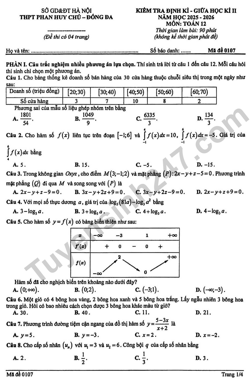 Đề thi giữa học kì 2 Toán 12 năm 2025 – 2026 trường THPT Phan Huy Chú gồm 4 trang với thời gian làm bài 90 phút. Các em tham khảo đề thi bên dưới: