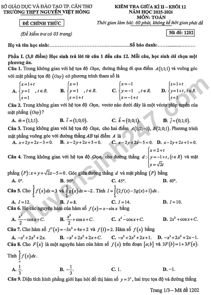 Đề khảo sát giữa kì 2 Toán 12 năm 2025 – 2026 trường THPT Nguyễn Việt Hồng gồm 12 câu trắc nghiệm nhiều phương án lựa chọn (3,0 điểm) + 04 câu trắc nghiệm đúng sai (4,0 điểm) + 03 câu trắc nghiệm trả lời ngắn (3,0 điểm), thời gian làm bài 60 phút.