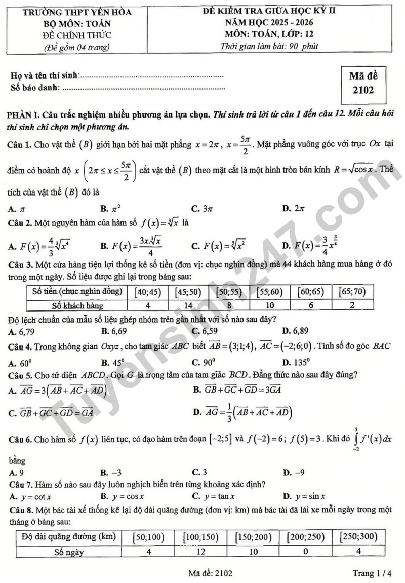 Đề thi giữa học kỳ 2 Toán 12 năm 2025 – 2026 trường THPT Yên Hòa gồm 4 trang với thời gian làm bài 90 phút. Các em tham khảo đề thi bên dưới: