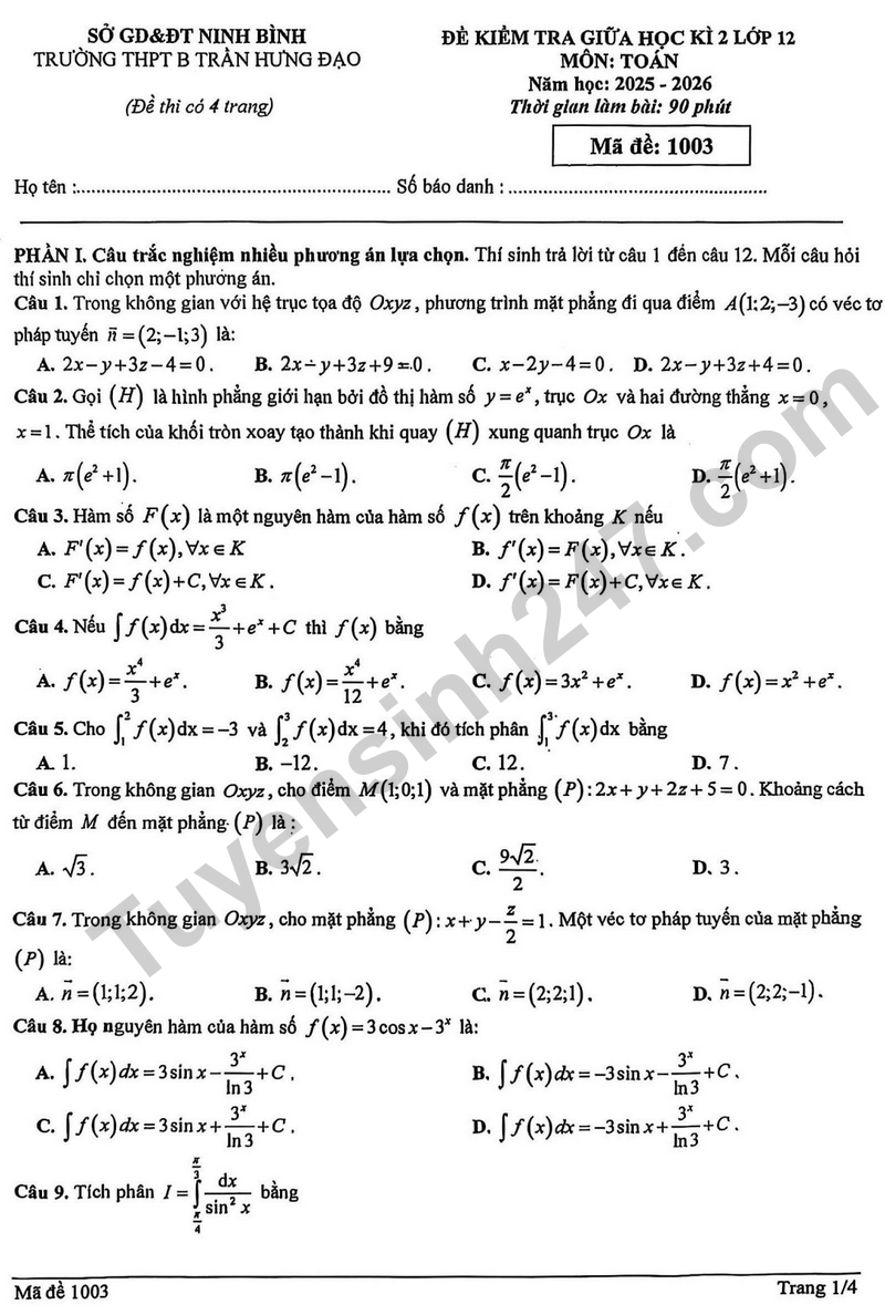 Đề thi giữa kì 2 Toán 12 năm 2025 – 2026 trường THPT B Trần Hưng Đạo gồm 12 câu trắc nghiệm nhiều phương án lựa chọn + 04 câu trắc nghiệm đúng sai + 06 câu trắc nghiệm trả lời ngắn, thời gian làm bài 90 phút.