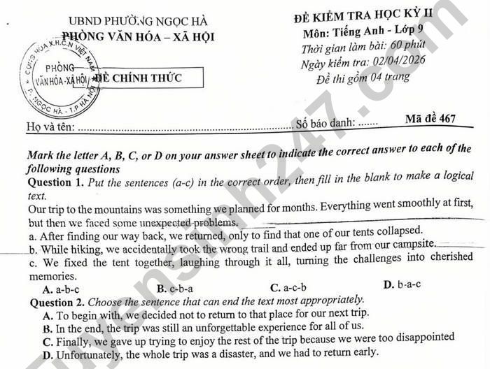 Các em học sinh cùng tham khảo dưới đây đề thi học kì 2 môn Tiếng Anh lớp 9 phường Ngọc Hà năm 2026.