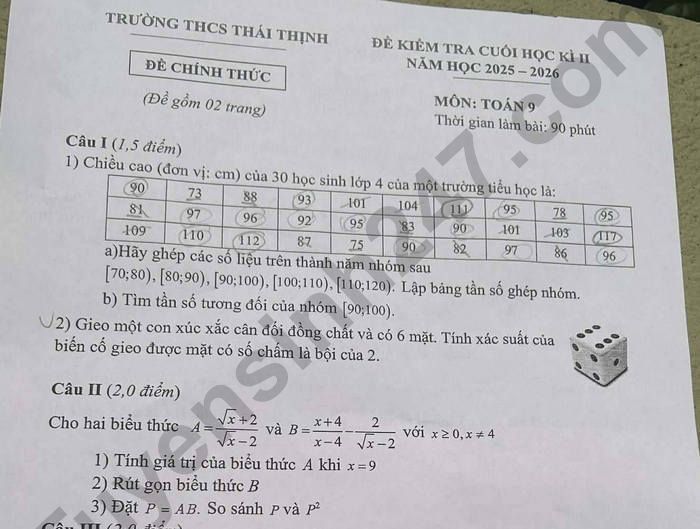 Đề chính thức kiểm tra học kì 2 lớp 9 môn Toán năm học 2025-2026 trường THCS Thái Thịnh, các em tham khảo nhé1