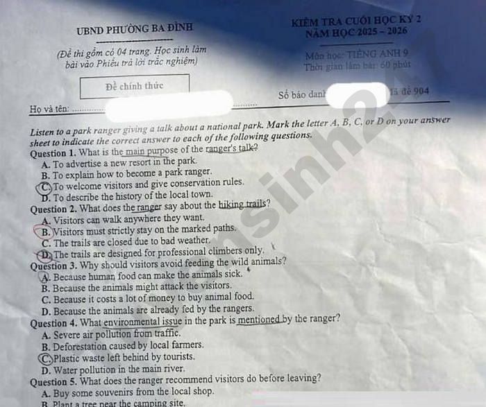 Đề thi cuối học kì 2 lớp 9 môn Anh của Phường Ba Đình năm học 2025 - 2026 mã đề thi 904, thời gian làm bài 60 phút.