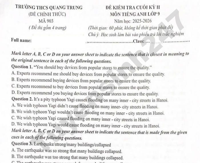 Đề kiểm tra học kì 2 năm học 2025-2026 môn Anh khối lớp 9 của trường THCS Quang Trung mã đề 903.