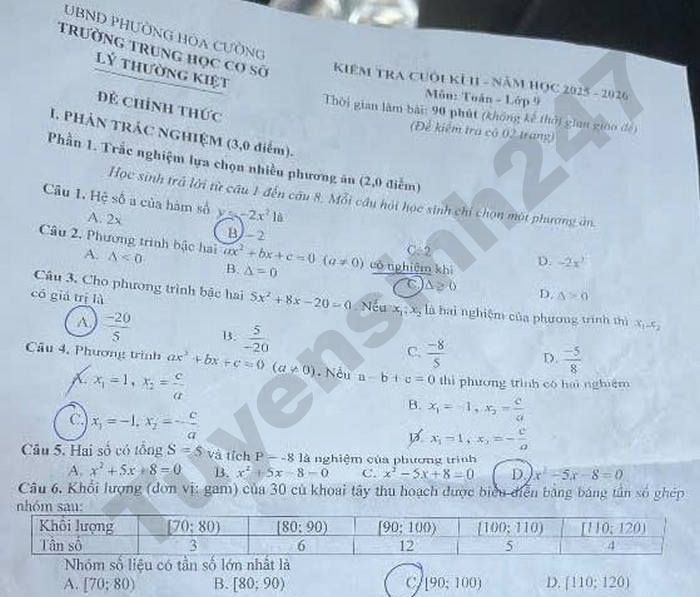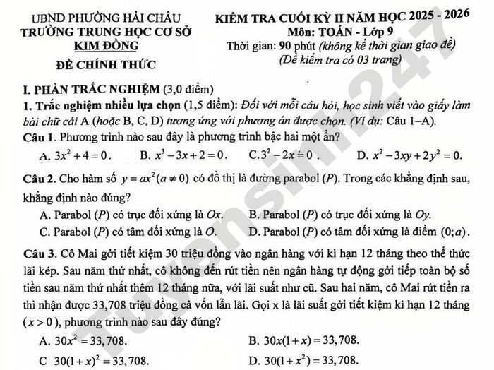 Đề kiểm tra cuối học kì 2 Toán lớp 9 trường THCS Kim Đồng, phường Hải Châu, Đà Nẵng năm học 2025 - 2026.