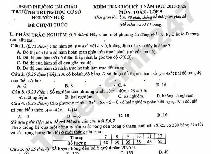 Đề thi học kì 2 lớp 9 môn Toán năm học 2025 - 2026 của trường THCS Nguyễn Huệ, Đà Nẵng gồm có 02 phần: Trắc nghiệm (3,0 điểm) và Tự luận (7,0 điểm).
