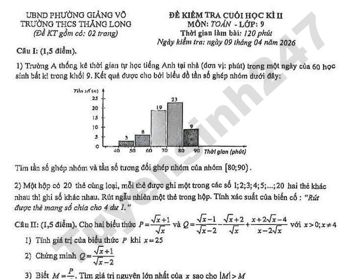 Đề thi học kì 2 Toán lớp 9 trường THCS Thăng Long, Hà Nội năm học 2025-2026, các em tham khảo nhé!