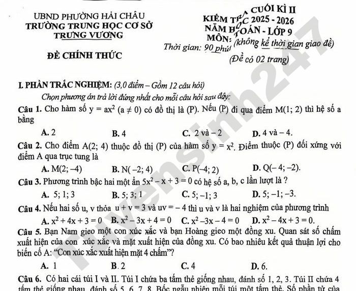 Đề chính thức kiểm tra học kì 2 năm học 2025 - 2026 trường THCS Trưng Vương - Đà Nẵng lớp 9 môn Toán, nội dung gồm có 02 trang.