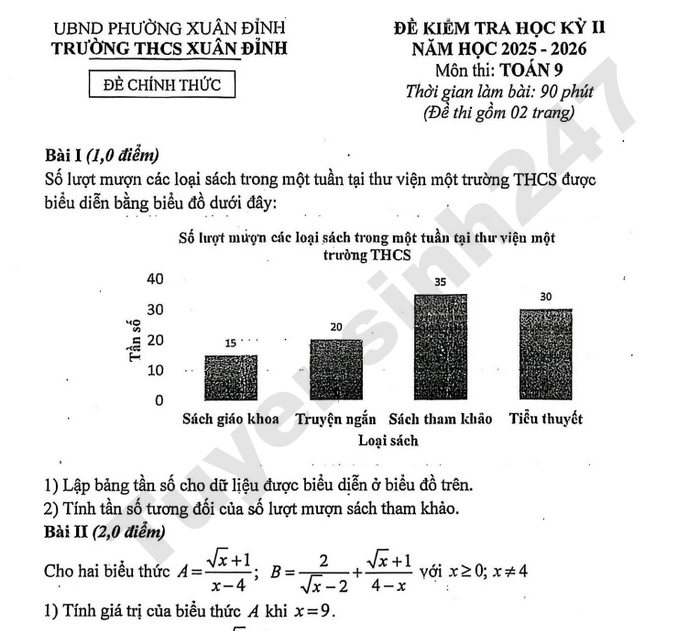 Xem chi tiết dưới đây đề thi học kì 2 lớp 9 môn Toán năm học 2025 - 2026 của trường THCS Xuân Đỉnh, Hà Nội.