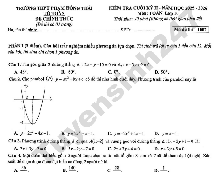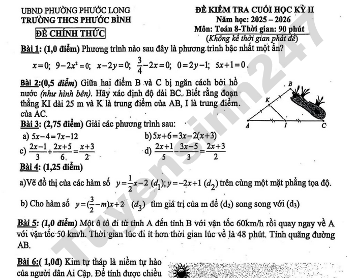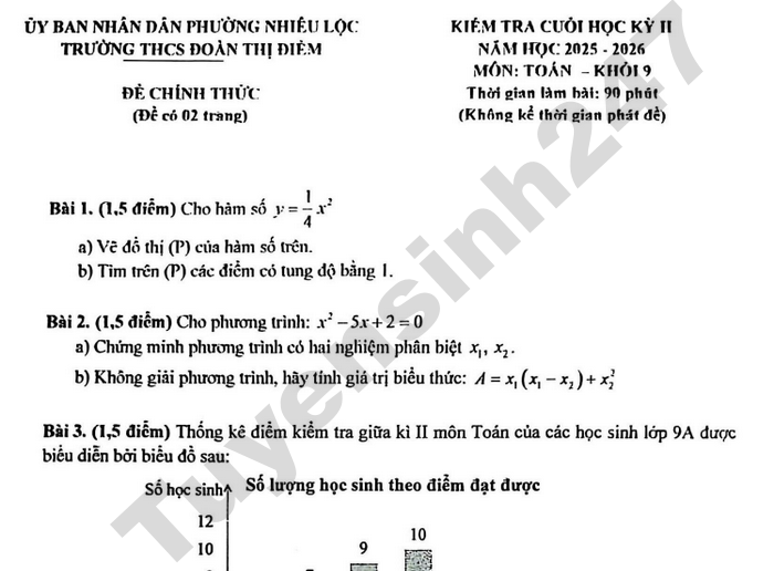 Đề chính thức kiểm tra cuối học kì 2 lớp 9 môn Toán trường THCS Phan Đình Giót, phường Thanh Xuân năm học 2025-2026.