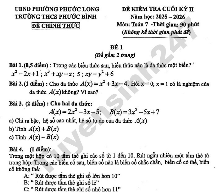 Đề thi học kì 2 lớp 9 môn Toán trường THCS Đồng Khởi năm học 2025-2026 nội dung chi tiết như sau: