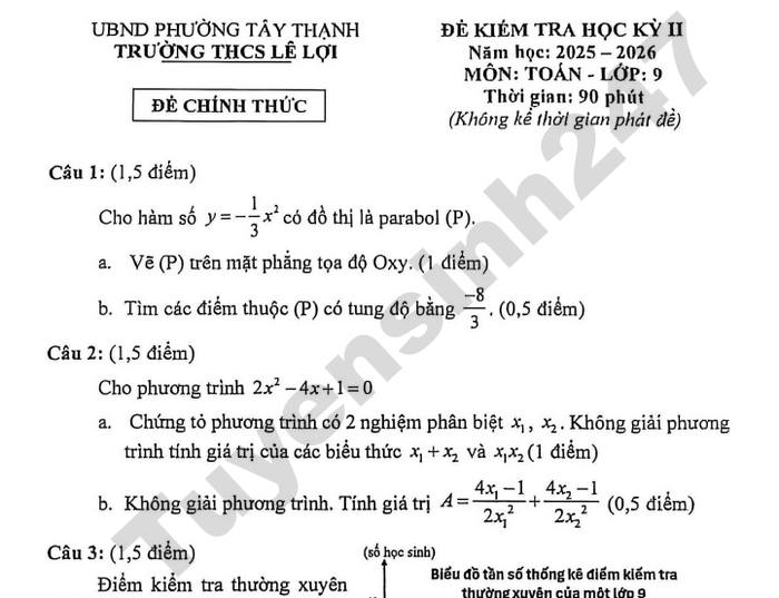 Đề thi cuối học kì 2 năm học 2025 - 2026 môn Toán lớp 9 của trường THCS Tây Sơn nội dung chi tiết như sau: