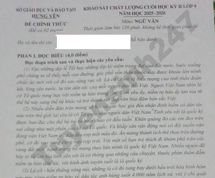 Đề KSCL cuối học kì 2 năm học 2025 - 2026 Sở GD&ĐT tỉnh Hưng Yên môn Văn lớp 9, xem chi tiết dưới đây.