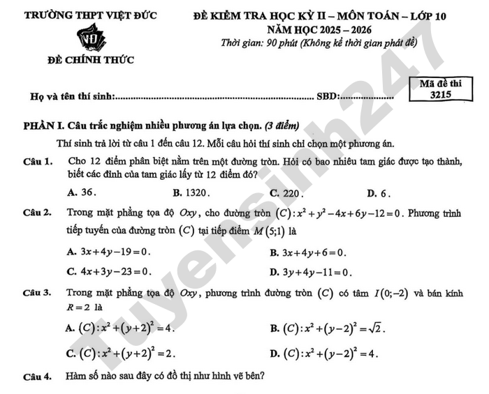 Đề kiểm tra cuối học học kì 2 môn Toán lớp 10 trường THPT Việt Đức, HN năm học 2025 - 2026 mã đề 3215 như sau: