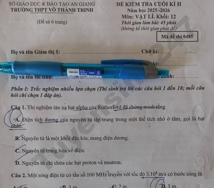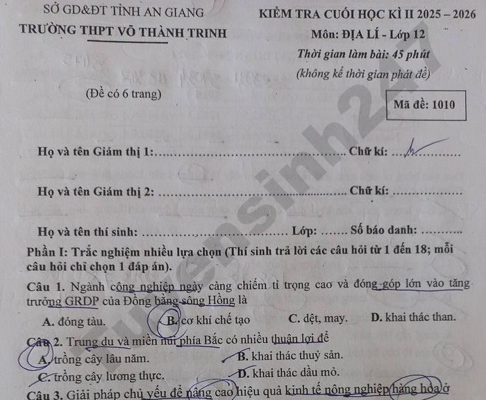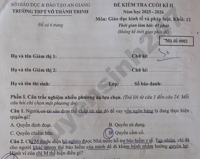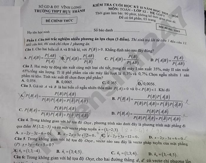Trường THPT Hựu Thành, Vĩnh Long tổ chức kiểm tra cuối học kỳ II năm học 2025-2026 cho học sinh khối lớp 12, xem chi tiết dưới đây đề thi môn Toán của trường.