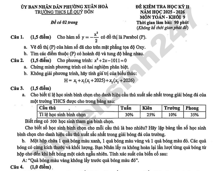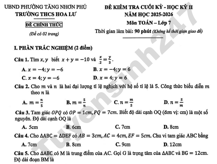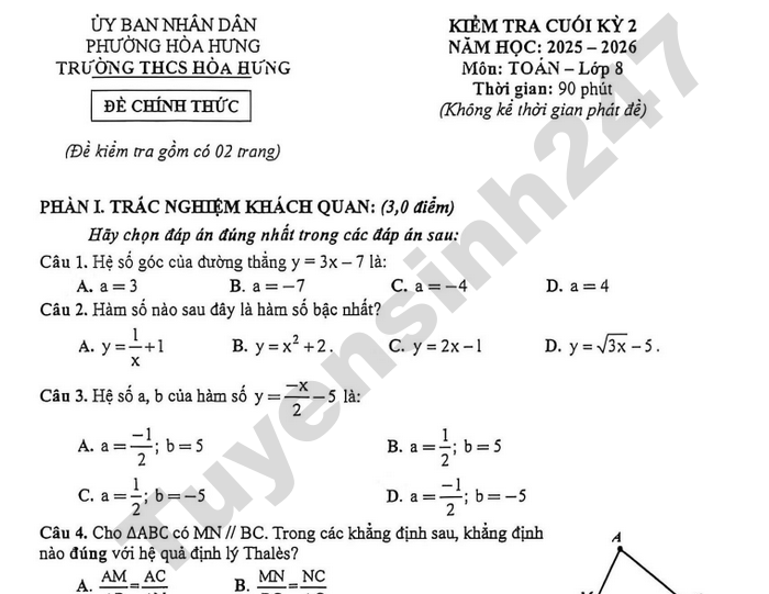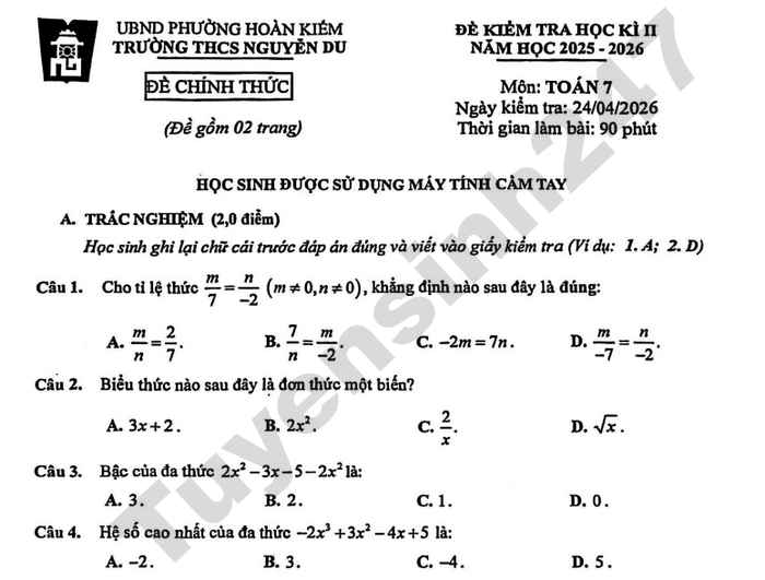 Đề chính thức kiểm tra học kì 2 lớp 7 môn Toán năm học 2025-2026 trường THCS Hoa Lư, TPHCM.