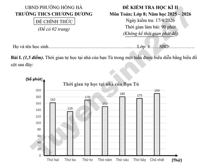 Các em học sinh tham khảo dưới đây đề thi học kì 2 Toán lớp 8 trường THCS Chương Dương năm học 2025-2026 có đáp án.
