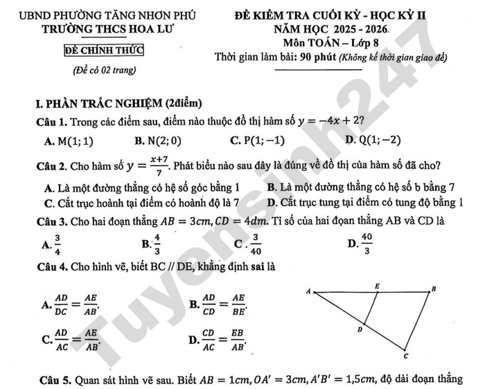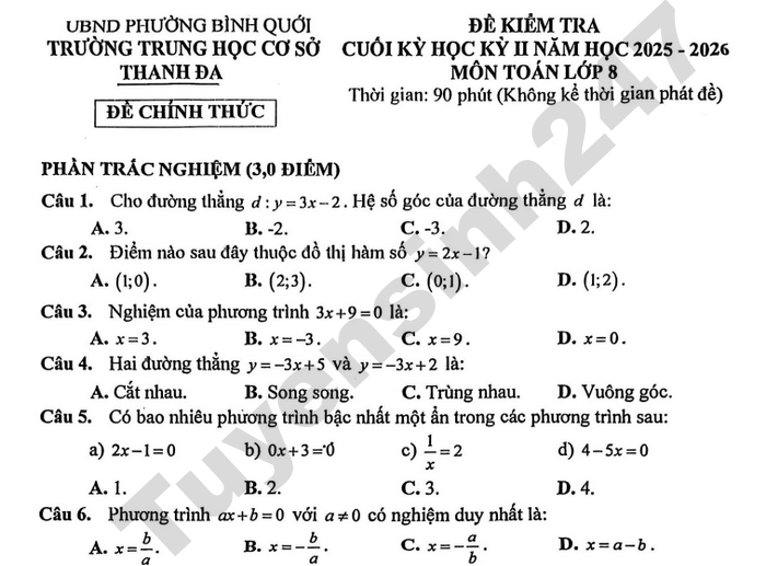 Tham khảo ngay dưới đây đề kiểm tra cuối kỳ - học kỳ II môn Toán lớp 8 trường THCS Hoa Lư năm học 2025-2026.