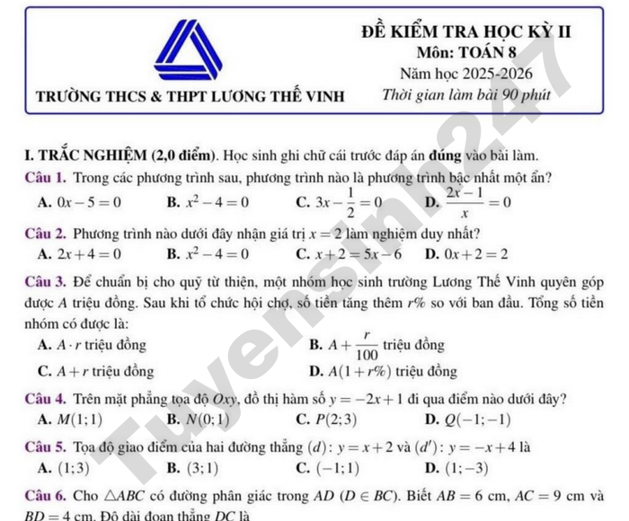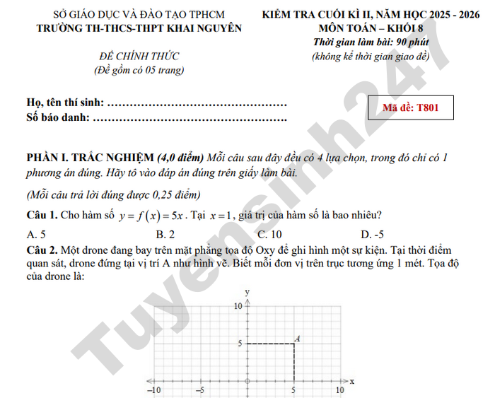 Đề kiểm tra cuối học kì 2 năm học 2025-2026 lớp 8 môn Toán trường TH-THCS-THPT Khai Nguyên, TPHCM có đáp án chi tiết.